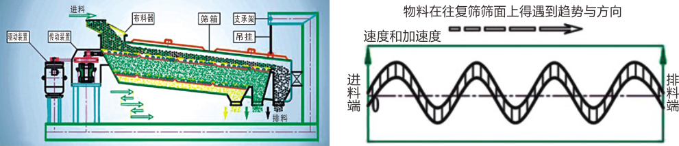 从筛箱运动轨迹来看,HM-PH平面回旋筛又称往复筛,其驱动装置所产生的振动力是一绕定轴方向呈一定规律变化的惯性力,是由偏心轮绕定轴转动所形成的往复惯性力。 其筛面一般为水平或微倾斜布置(倾斜角度为0°-5°)。筛机启动后,筛箱在惯性力的作用下作前后往复运动,从而带动筛面作周期性摇动,使筛面上的物料随筛箱一同作定向跳跃式运动,期间,小于筛面孔径的物料通过筛孔落到下层,成为筛下物,大于筛面孔径的物料经连续翻滚跳跃运动后从排料口排出,完成筛分工作。
