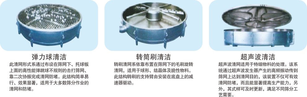 ◆ 使用耐磨弹力球、超声波等**清网装置系统,针对球形物料滚刷设计,解决任何物料品种筛孔堵塞问题。